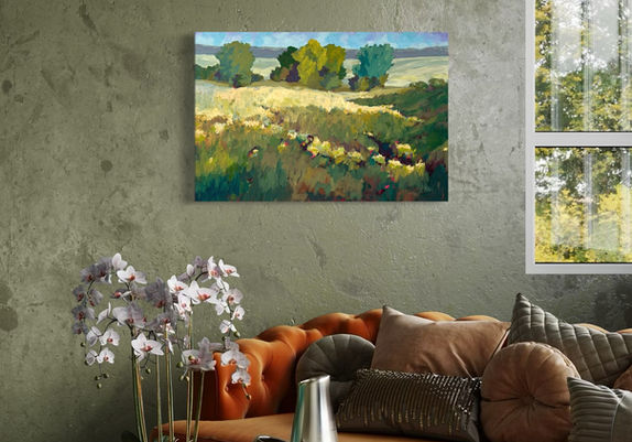 The artwork is a landscape painting showcasing a serene outdoor scene. It depicts a lush meadow filled with various shades of green vegetation, highlighted with splashes of yellows, whites, and some hints of red, suggesting blooming flowers. The background contains a line of trees in greens, blues, and yellows, which stand against a soft, light horizon. The sky is painted with broad, smooth brush strokes in blues and purples, indicating a calm and clear day. The use of vibrant colors and bold brushstrokes gives the painting a lively yet tranquil atmosphere.